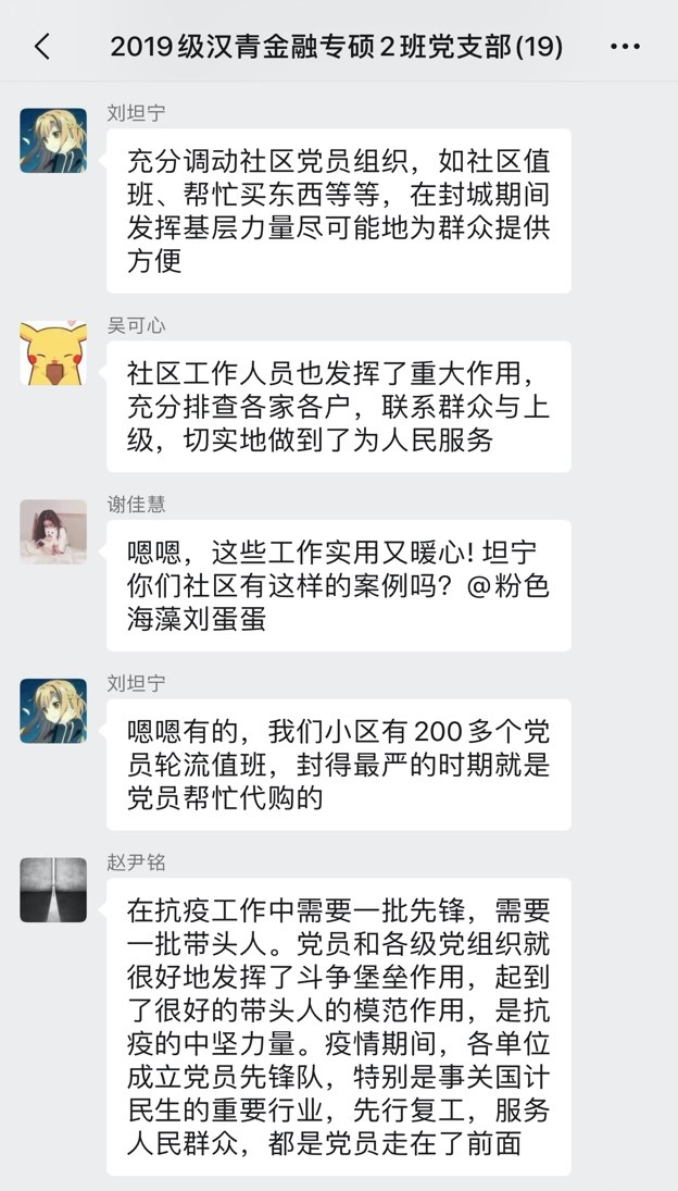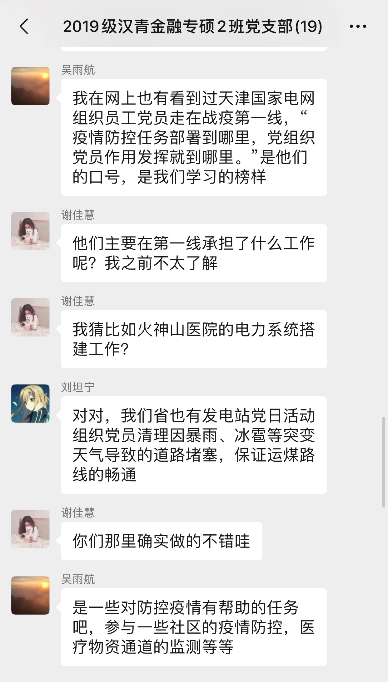 接下来,支部成员们在微信群中分享了疫情期间身边党员同志的先锋模范事例。王晨晖同学分享了一个首都高校学生党员抗击疫情的事例。疫情期间,许多大学生党员自愿加入基层抗疫志愿者,为抗疫工作贡献了自己的一份力量。有些志愿者参加援鄂医疗队、有些坚持线上做义工,也有人发挥专长做心理咨询师等等。他表示,在这次抗击疫情的过程中,党员和各级党组织充分发挥了带头模范作用,大学生党员也展现了中国青年的精神风貌。谢佳慧同学提到有一批党员自愿成为新冠疫苗的首批志愿者,她们是为大家默默付出的人,是逆行者,也是值得我们学习的榜样。这些榜样的存在,为我们的前行提供了方向。