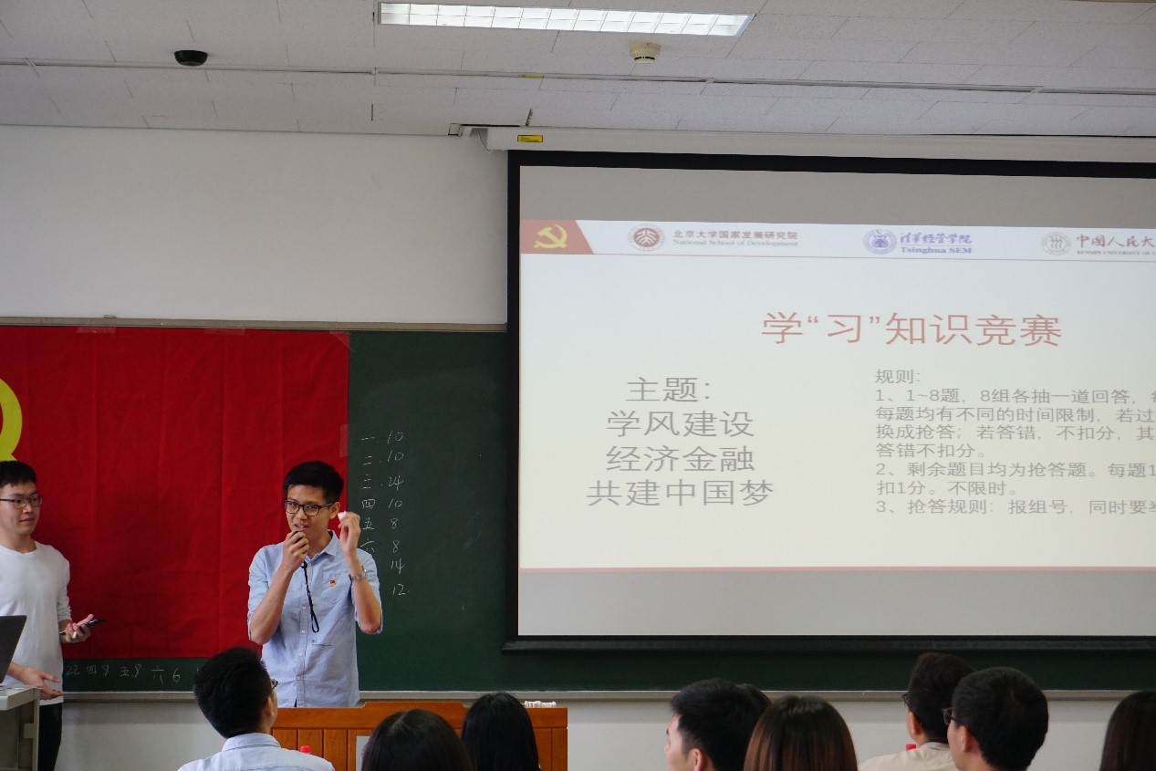 为纪念中华人民共和国建国70周年和五四运动100周年,进一步学习贯彻习近平新时代中国特色社会主义思想,加强学风建设,加强与友校党支部的交流学习和相互联系,2019年5月11日上午,色情动漫 18级金融专硕一班党支部、北京大学国家发展研究院18级研究生党支部和清华大学经济管理色情动漫经博18党支部在清华大学新水利馆327教室举办了以“博览经言树学风,同心共筑中国梦”为主题的三校党团共建活动。活动旨在倡导牢记建国70周年革命成果,在当代大学生中树立优良学风,为实现中华民族伟大复兴的中国梦添砖加瓦。除了各支部的党员,出席本次活动的还有发展对象、积极分子和优秀团员代表。