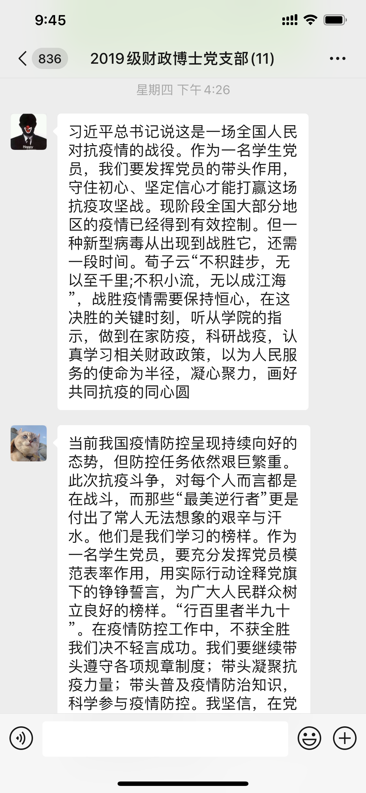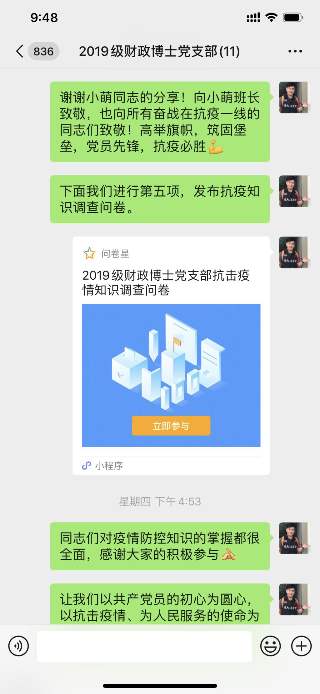 2020年3月5日下午4点,2019级财政博士党支部在支部微信群召开了本年度第二次线上会议。本次会议由党支部书记郭雨萌主持,全体成员参与。时值巩固抗击新型冠状病毒疫情的关键时期,全体党员在线上积极交流,充分发挥战斗堡垒作用和先锋模范作用,巩固深化了“不忘初心、牢记使命”主题教育成果。