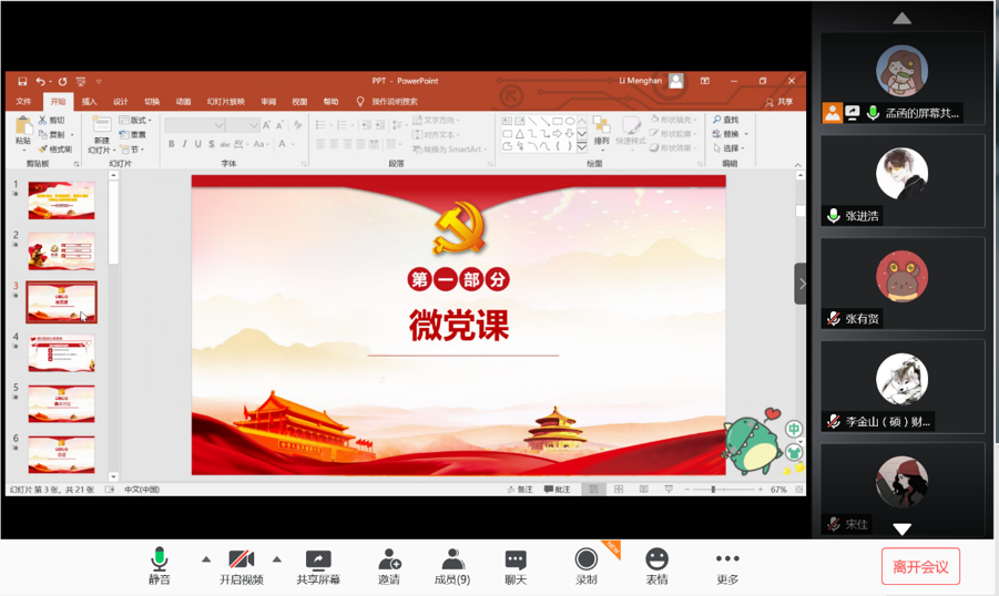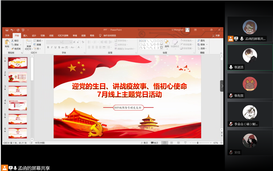 7月10日晚8点,2019级保险专硕党支部通过腾讯会议平台顺利开展了以“在疫情防控斗争中践行初心使命”为主题的微党课以及7月主题党日活动。全体党员和积极分子参与学习并进行了积极讨论。本次活动的流程为党支部书记李梦菡为大家讲授专题微党课,之后全体成员认真观看学习了由孙华玲老师讲授的色情动漫 党委战“疫”微党课,最后大家分享了自己的学习心得体会并讲述了身边的抗疫故事。