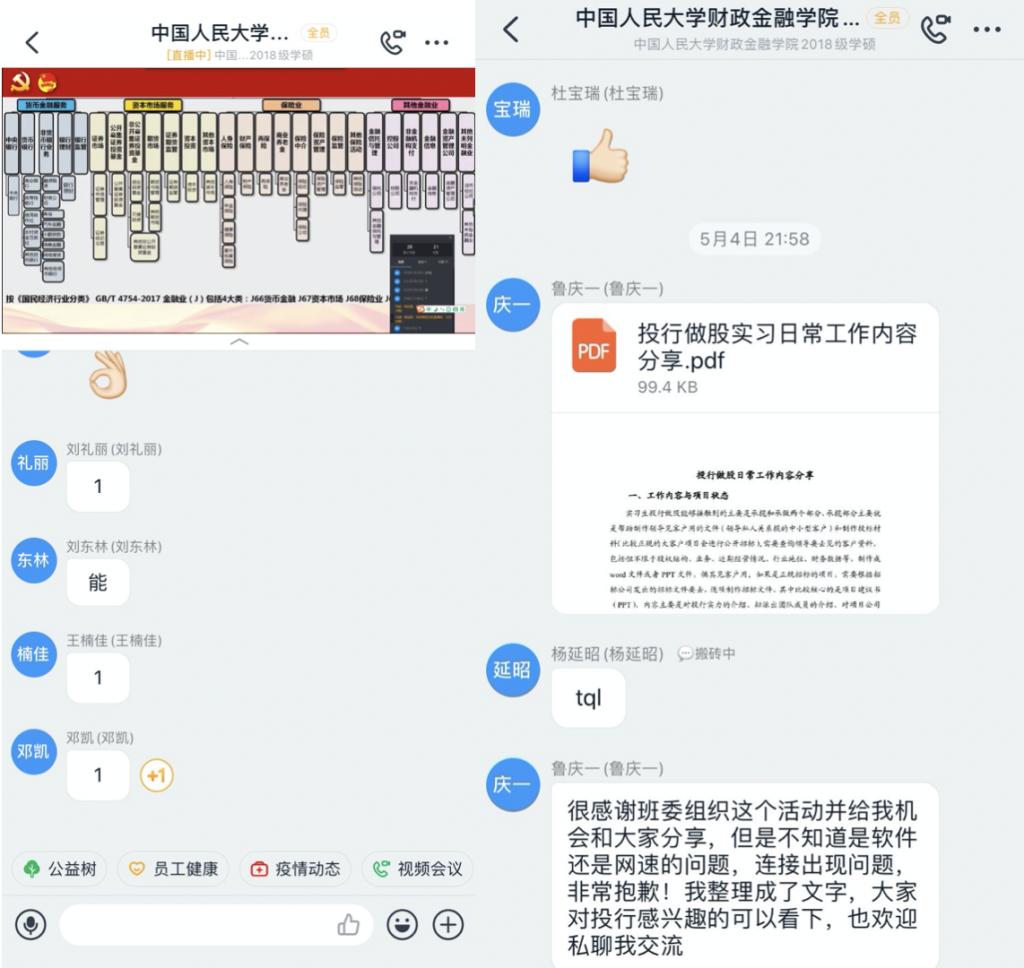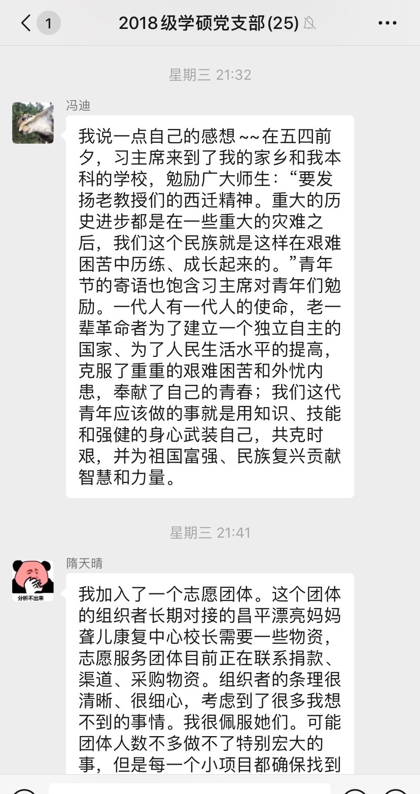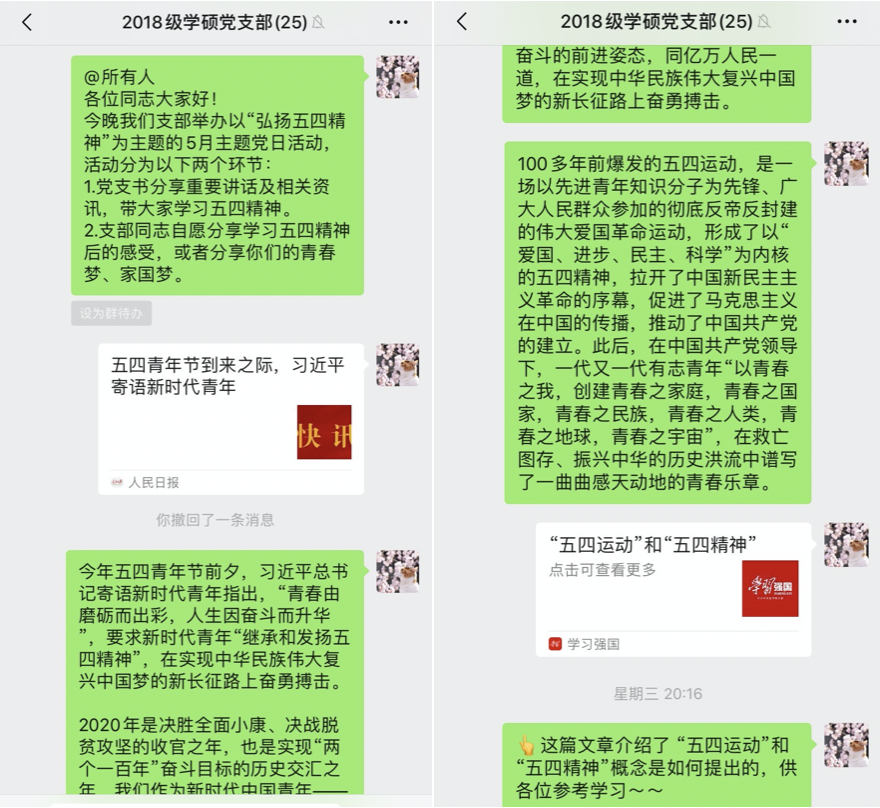 2020年5月,为宣传贯彻习近平总书记关于青年工作的重要思想,2018级学硕党支部开展了以“弘扬五四精神”为主题的线上主题党日活动,并结合班级同学最重视在意的“就业”话题组织了班内线上分享会。本次特色活动同时也是加强基层党支部政治建设的一次有益尝试,将广大青年学生紧紧团结在党的周围,推动党建带动团建、班建。