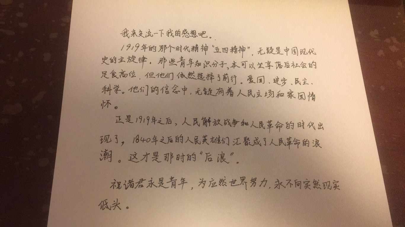 随后,党支部书记李欣怡同志分享了“五四精神”的历史资料和相关短片,勉励支部成员继承和发扬五四精神,做中国梦的追梦人和圆梦人。回首百年,在中国共产党的坚强领导和五四精神的激励下,广大有志青年不断奋进,以青春之我、奋斗之我,书写了无愧于时代、无愧于人民、无愧于历史的华章。五四精神代代相传,在今年新冠疫情阻击战中,有许多新时代青年舍小家为大家,勇敢担负起光荣使命,是我们学习的榜样。