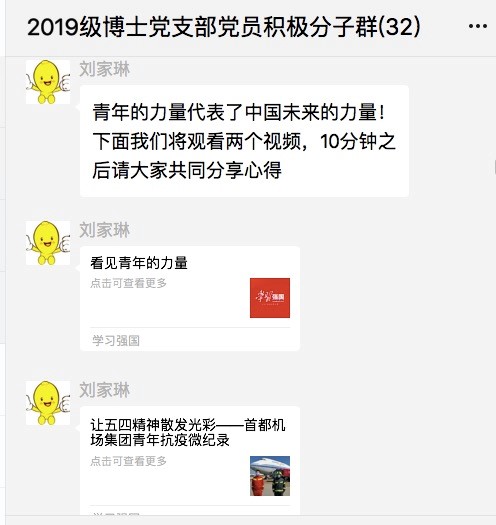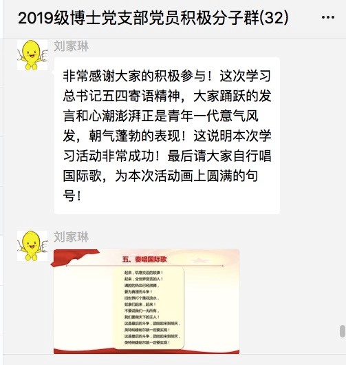 2020年5月11日晚9点,2019级金融博士党支部通过微信线上讨论方式,顺利开展“弘扬五四精神”主题党日活动,会议由刘家琳书记主持。