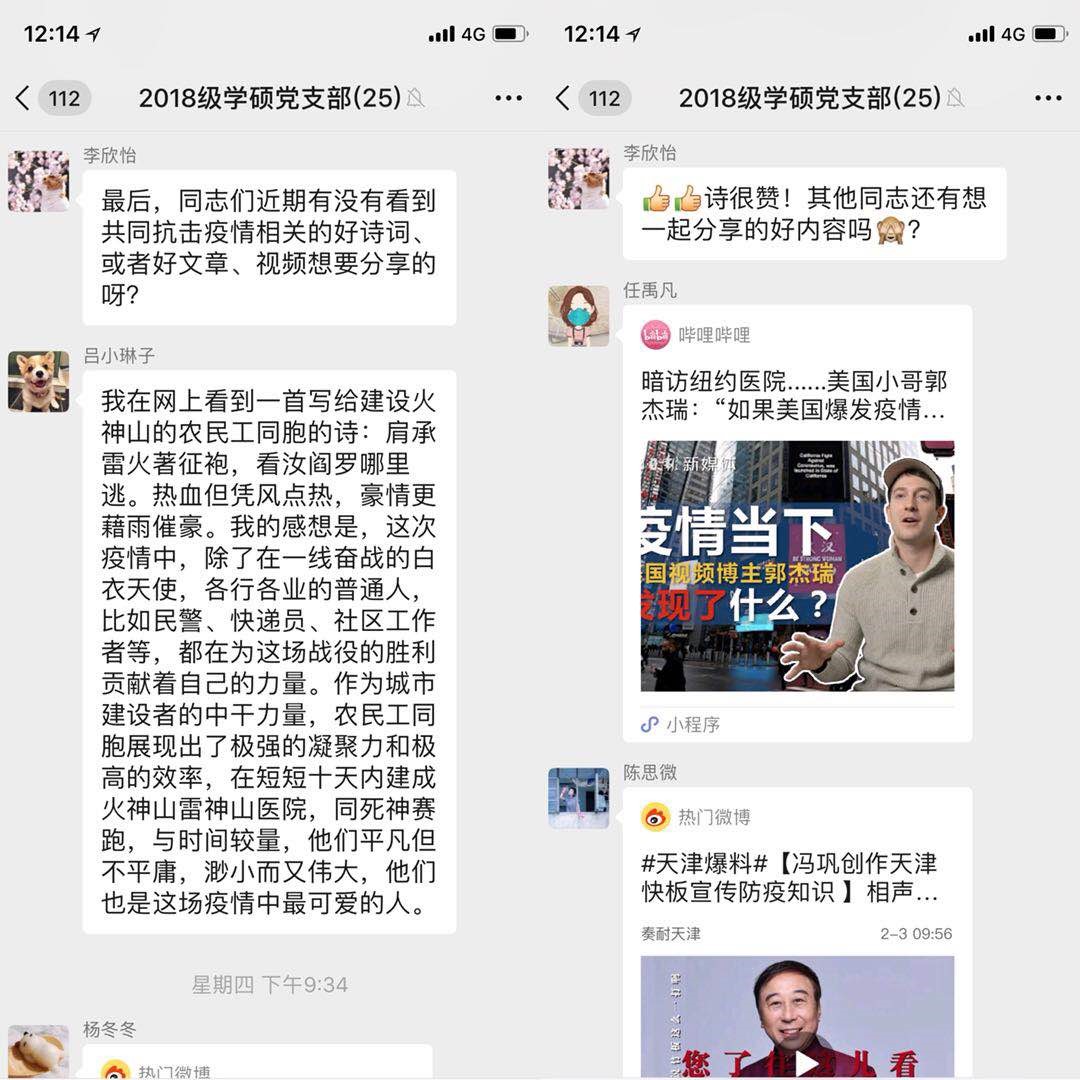 第三部分,同志们分享了令人感动的抗击疫情相关的好诗词、好文章及好视频,并发表分享感言。吕琳同志首先分享了一首网络上写给建设火神山的农民工同胞的诗并发表自己的看法,作为城市建设者的中干力量,农民工同胞展现出了极强的凝聚力和极高的效率,在短短十天内建成火神山雷神山医院,同死神赛跑,与时间较量,他们平凡但不平庸,渺小而又伟大,他们也是这场疫情中最可爱的人。李欣怡同志分享了深圳女孩刘洁为抗击疫情专门录制的英文短视频,并发表感言:“这个视频让我感动,我们都是战斗者,应当和未知、恐惧、怀疑、自私、谣言斗争。中华民族作为一个勇敢的民族,绝不会被病毒打倒,因为我们拥有必胜的精神、历史和决心!”其他同学也都纷纷结合分享的好诗词、文章及视频发表了自己的看法。