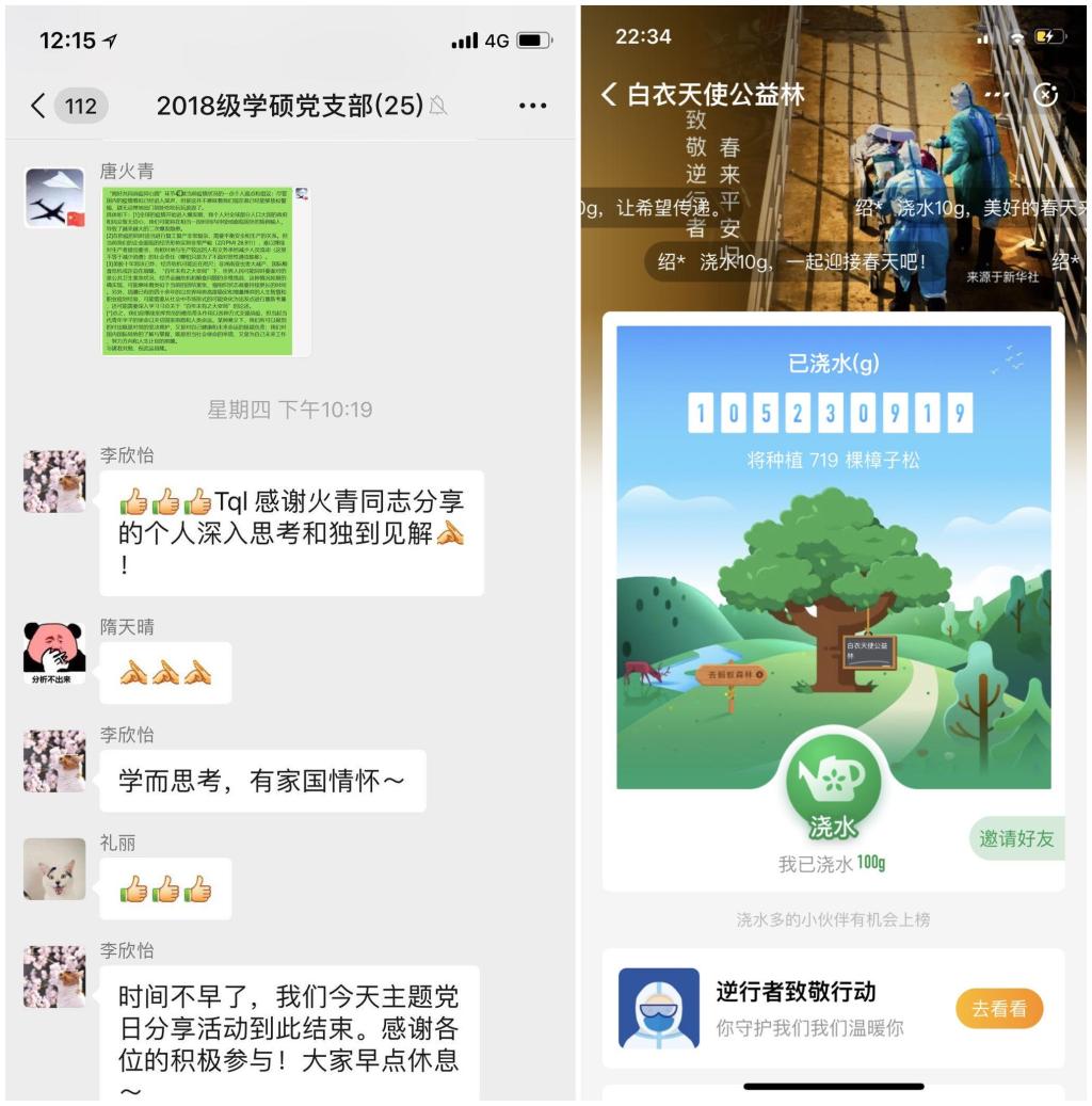 最后,支部书记李欣怡同志做了活动总结,并倡议支部同志们在3月12日植树节参与到云种树活动中,一起为支付宝蚂蚁森林“白衣天使公益林”浇水。同志们纷纷响应,并将截图分享到支部微信群。色情动漫 2018级学硕党支部“画好共同战疫同心圆”党日活动在同志们的积极参与下圆满结束!