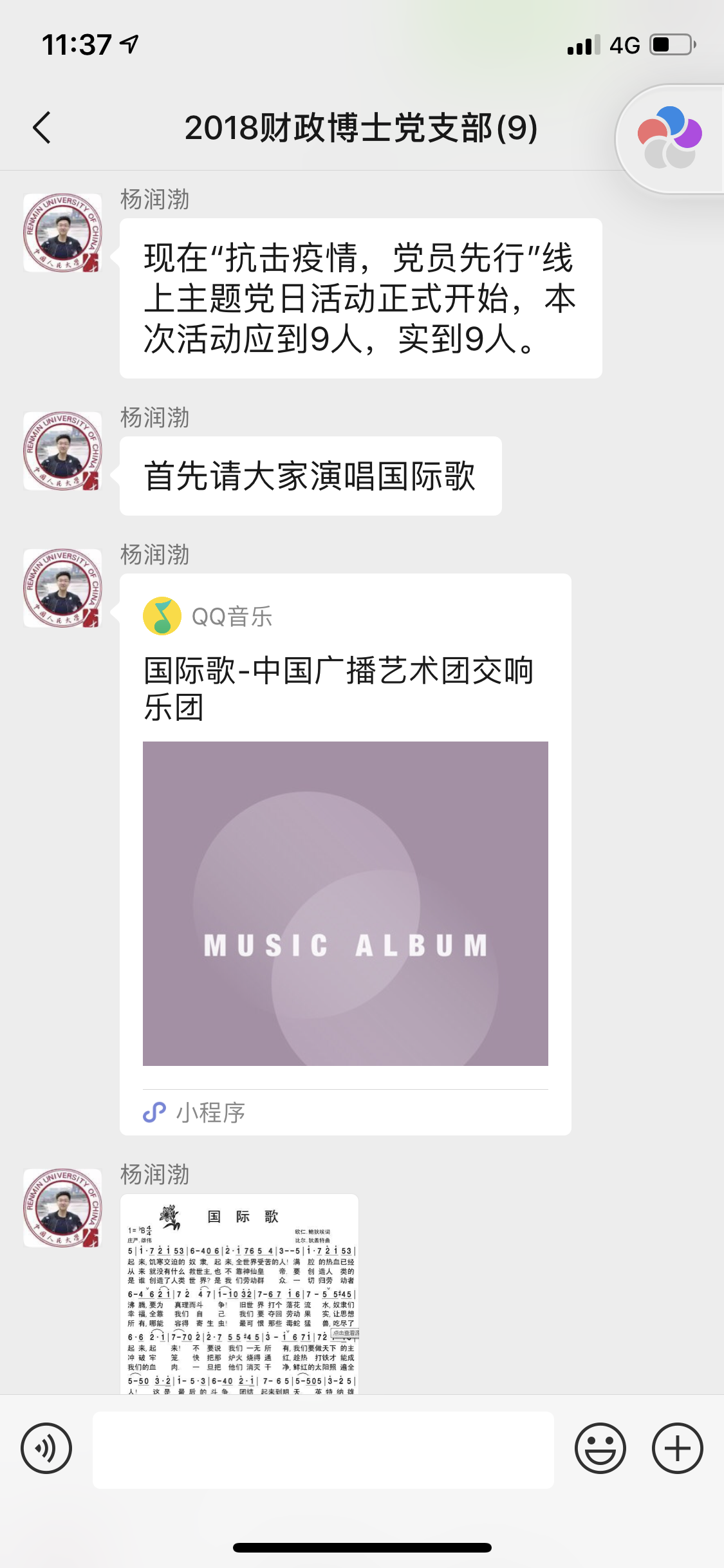 在当前防控疫情背景下,为继续促进党员的进步和学习,更好地发挥基层党支部的战斗堡垒作用,2018级财政博士党支部积极响应学校号召,以线上学习的形式开启了2020年春季学期第一次主题党日活动。本次当日活动以“抗击疫情,党员先行”为主题,于2020年2月12日晚在微信群正式开始,会议由杨润渤书记主持,党支部全体9位同志积极参与。