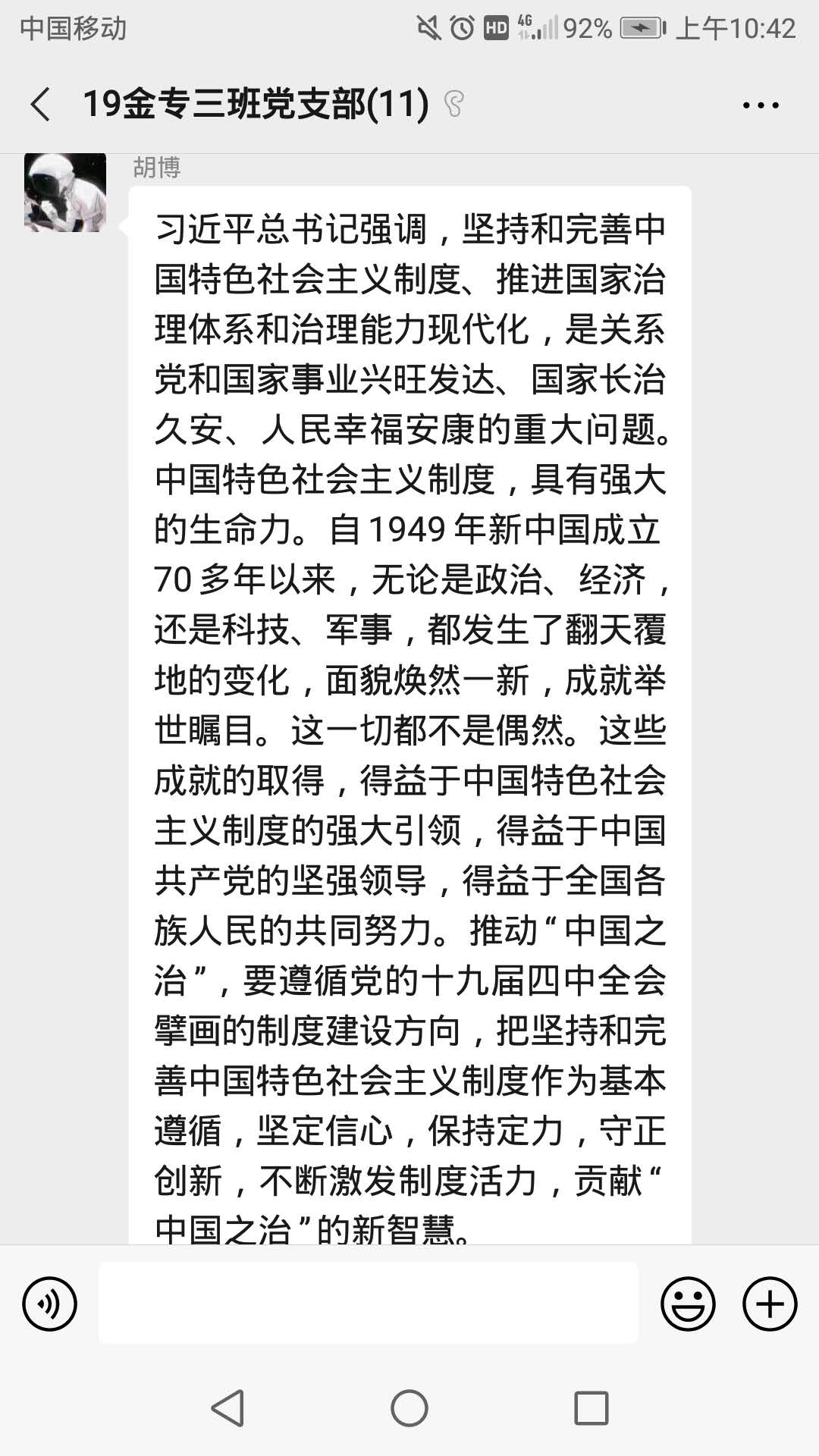 2020年10月19日20点30分,2019级金融专硕三班通过自行学习和线上交流讨论的方式开展了“理论学习分享—习近平谈治国理政第三卷”主题党日活动,本次主题党日活动共有9名正式党员参加。会议由支部书记徐滢主持。