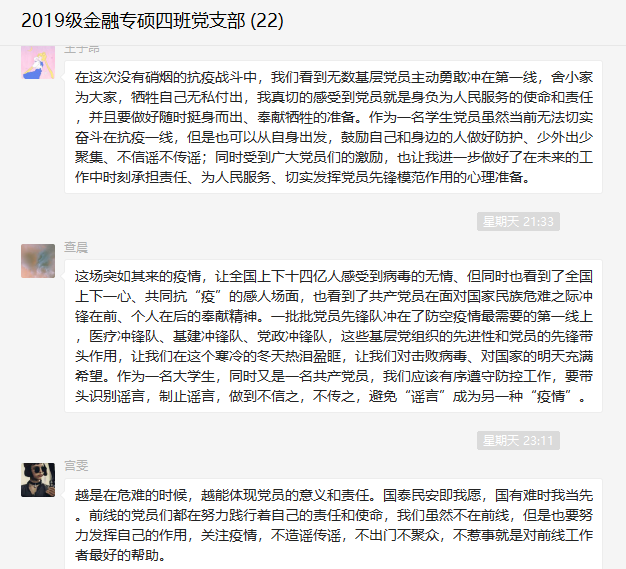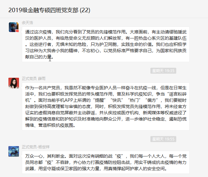 响应上级党委号召,2019级金融专硕四班党支部于2月8日在微信群中举办“抗击疫情,党员先行”线上党日活动。