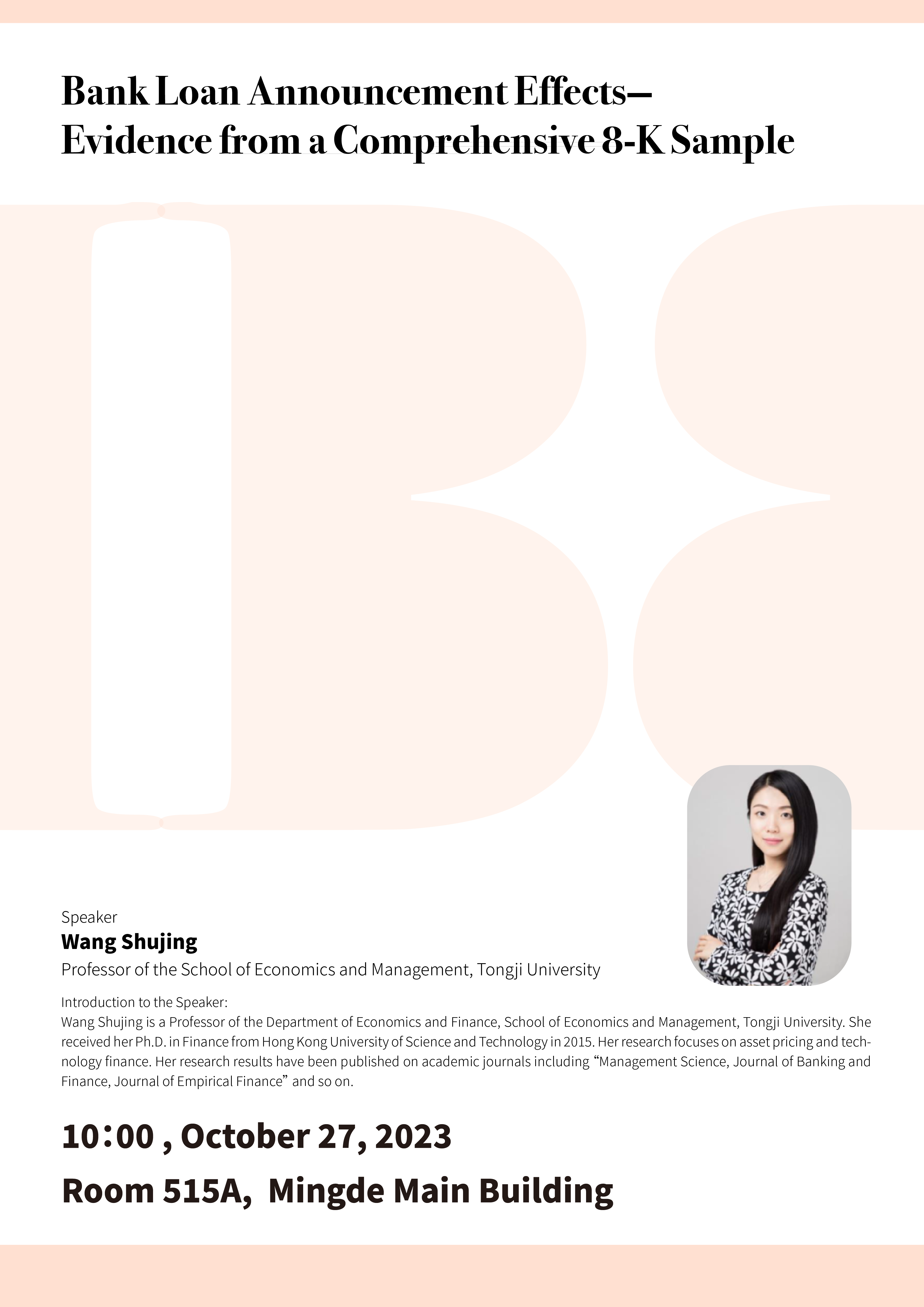 Wang Shujing, Professor of the School of Economics and Management, Tongji University, will give a lecture entitled “Bank Loan Announcement Effects—Evidence from a Comprehensive 8-K Sample” at 10:00 a.m. on Oct. 27.