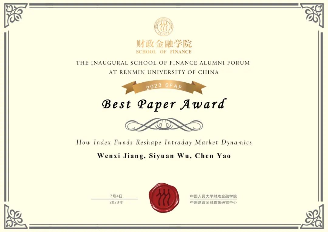 The Forum also set up a best paper award. After rigorous review, the award was conferred on Jiang Wenxi, an associate professor of the Chinese University of Hongkong and a 2007 alumnus of the School of Finance, for his co-authored paper “How Index Funds Reshape Intraday Market Dynamics”.