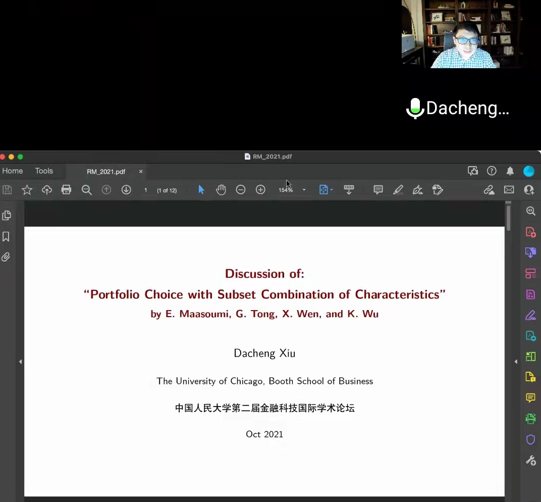 吴轲副教授分享了他的研究——“Portfolio Choice with Subset Combination of Characteristics”,吴教授提出了一种基于大量公司特征的完全子集组合(CSC)的新投资组合策略。CSC策略在均方差效用下易于实施,并且可以适应具有一般效用函数的投资者。使用92个特征对美国个股的实证应用表明,CSC策略实现了理想的确定性等效回报和夏普比率,且优于常用机器学习工具的替代组合或特征选择策略。修大成教授针对论文的应用和模型改进提出了宝贵而有见解的建议。