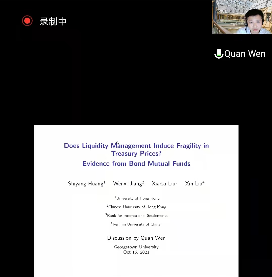 刘昕博士汇报了论文——“Does Liquidity Management Induce Fragility in Treasury Prices? Evidence from Bond Mutual Funds”,持有非流动性资产(例如公司债券)的债券共同基金积极管理其国债头寸以缓冲赎回冲击。文章论证并展示了支持性证据表明这种流动性管理做法会导致国债价格的脆弱性,并通过利用两个可能的外生事件来解决内生性问题:COVID-19的爆发和2003年共同基金丑闻。乔治城大学的温泉教授就论文的理论基础和实证设计交流了自己的宝贵经验。