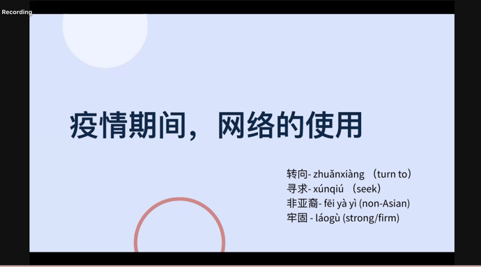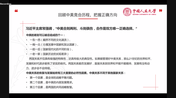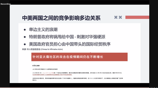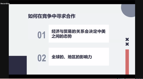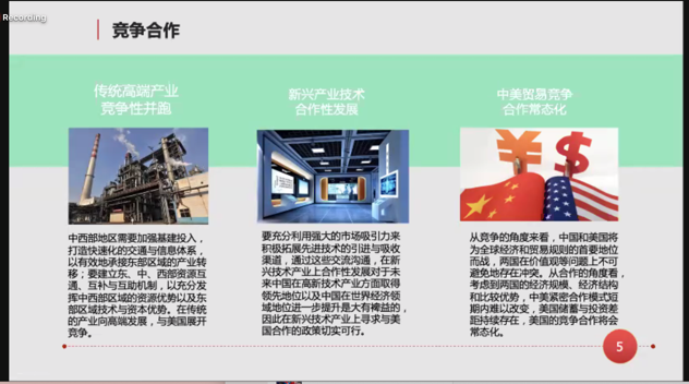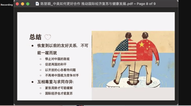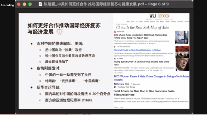 来自匹兹堡大学的Rebecca Chuhui Chen同学阐述了中美合作的条件,并针对中美合作推动国际经济复苏与健康发展发表了自己的观点。