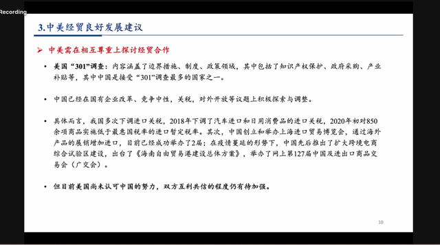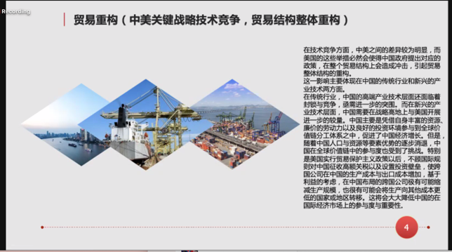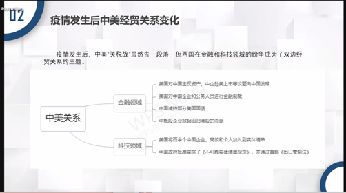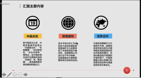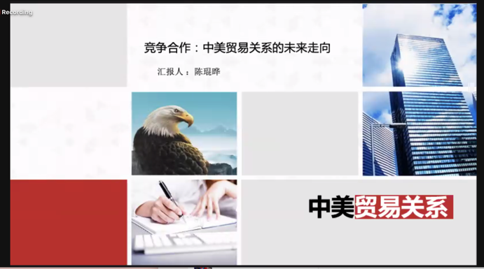 来自山东财经大学的徐蕾同学按照时间顺序对中美经贸关系进行了梳理,分析了中美双方目前面临的问题,从而对后疫情时代中美双边经贸关系的走向进行了探讨。