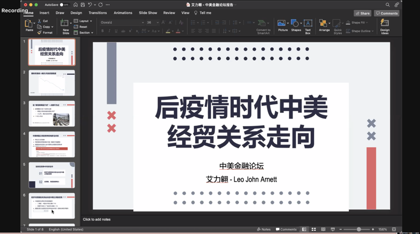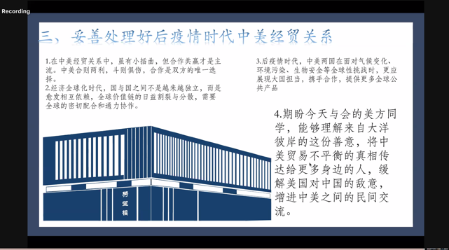 来自乔治城大学的Leo John Arnett同学指出后疫情时代中美经济复苏对全球经济的影响,并就中美经贸关系走向等问题进行了展示与交流。