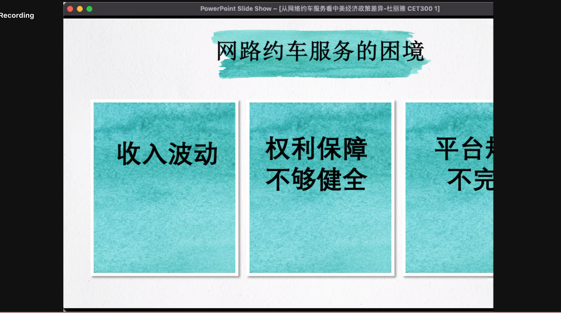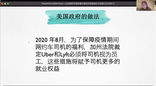 来自耶鲁大学的Aurelia Dochnal同学以中美两国的网络约车服务为例,探讨了后疫情时代中美两国在网络约车服务市场逐渐回暖之后的应对政策以及中美经济政策的差异。