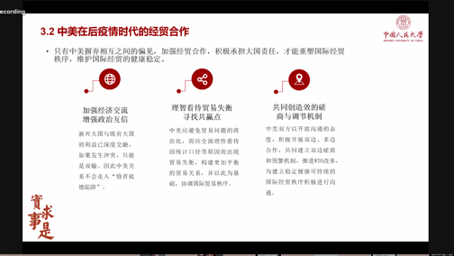 在本次论坛中,中美学生分析了后疫情时代的中美经贸关系走向和全球经济振兴的内在逻辑,探讨了合作与竞争中存在的机遇与挑战。本次论坛为中美高校学生提供了思想碰撞的平台,使中美学生更加深入地了解了中美经贸关系,建立了中美双方青年一代的深厚友谊。