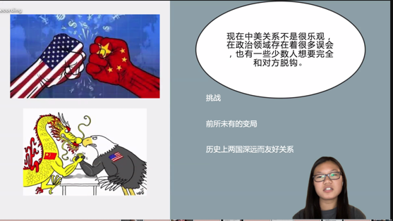 来自皮吉声大学的Tiffany Pi同学从历史的角度讨论了中美建立国家关系的重要性与两面性,并通过实例简要说明了网络对建立中美关系的积极作用。