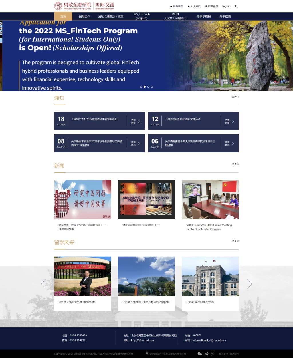 新版国际交流主页菜单设置了新闻活动、国际合作、国际(港澳台)交流、MS_FinTech、MFIN(人大女王金融硕士)、外事学期报、办事指南等栏目。