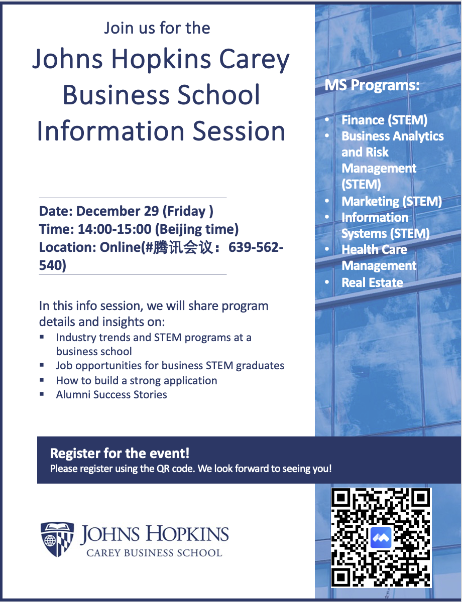 讲座预告 | 美国约翰霍普金斯大学凯瑞商学院宣讲会