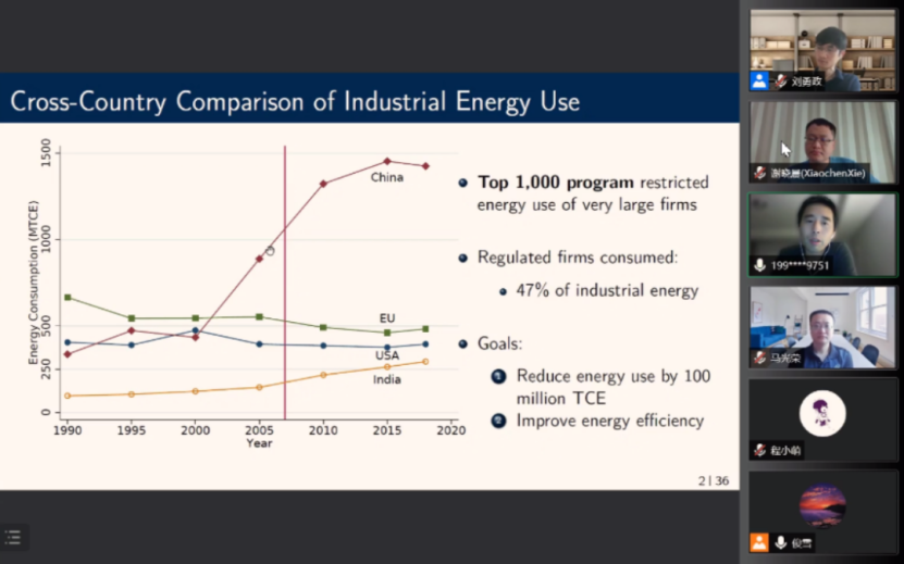徐熠教授的讲座主要分为三部分。首先,徐熠教授介绍了中国能源消耗管制的政策背景并提出了研究问题。21世纪以来中国工业飞速发展,随之而来的是能源消耗的快速增长以及环境污染的加剧,为了减少中国能源密集型产业的能源消耗,中国政府在2006年出台了《千家企业节能行动实施方案》,目标是在“十一五”期间减少1亿吨标准煤,在2004年能耗前1000的企业能耗减少20%。中国9个能源密集型产业的千家头部企业是全国能耗的主力军,其能耗占中国总能耗的33%,工业能耗的47%,因此中央政府制定了方案,目标逐层分解对口减少这些大企业的能耗。地方政府通过协商谈判制定企业节能目标,直接负责千家企业节能目标的实现,并将其纳入了地方政府官员的政绩考核。于是到2010年,98%的企业都实现了方案规定的20%的节能目标。为进一步实现节能目标,2012年《千家企业节能行动实施方案》被拓展到了万家企业(《万家企业节能低碳行动实施方案》),目标是实现2.5亿吨标准煤的节能目标。那么,这一节能政策能否实现提高被规制企业能源利用效率的目的?被规制企业的产出如何变动?被规制的大企业、集团内部相关企业之间以及市场各主体间会有怎样的反应?政府能否通过观察集团网络的信息提高管制政策的效率?徐熠教授和合作者对这些问题进行了详细的分析。