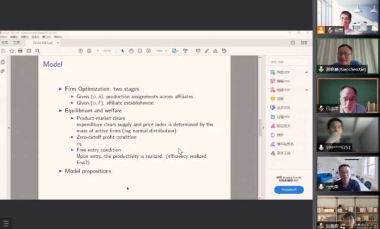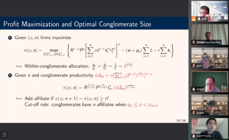 谢晓晨助理教授对徐教授的全文做了总结回顾,并就模型部分进行了点评:该模型简洁明快,与文章内容紧密关联,无任何冗余复杂部分,显示了深厚的理论功底。该模型需求端使用CES模型,供给端使用了基本竞争假设,但徐老师为了解决企业间的能源分配决策对模型进行了拓展,如使用里昂惕夫投入函数,突出了能源使用在模型中的独特性和重要性;假设企业是规模报酬递减的,避免了集团中企业集中生产的可能性;对集团各公司生产率进行了差异化的假设,体现了各公司的产出差别。接下来利用两阶优化求解并计算均衡解和社会福利。参数估计方法简洁,拟合结果贴切。最后,谢老师表达了对本文的高度赞赏。