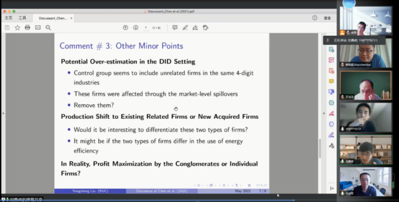 接下来,刘勇政教授和谢晓晨助理教授分别进行了总结与点评。刘勇政教授表明“徐熠教授的研究是非常重要且具有挑战性的”,然后就实证部分提出了一些建议:第一,文章结论发现政策对能源效率没有影响,但官方文件指出能源效率在十一五规划之间提高了19%,这引出了另一支有趣的文献,即官方加总数据与现实微观数据之间存在偏差。第二,关于政府允许的产能在集团内部企业之间的转移,文中仅汇报了产量变动而未汇报能源使用情况,不知道这些企业受溢出效应影响的企业能源消耗的情况如何。第三,一些小的方面,简约式估计有高估结果的可能,这也是徐老师使用结构模型的原因,但是简约估计中去除掉了非关联企业而在模型中没有去除非关联企业,是否可以考虑去除;相关联企业是新并购的还是原有的,区分是否有意义;模型中假设集团同时做决策,现实中集团同时做决策的可能性有多大;在集团层面做管制的话,市场溢出效应是否会变强。