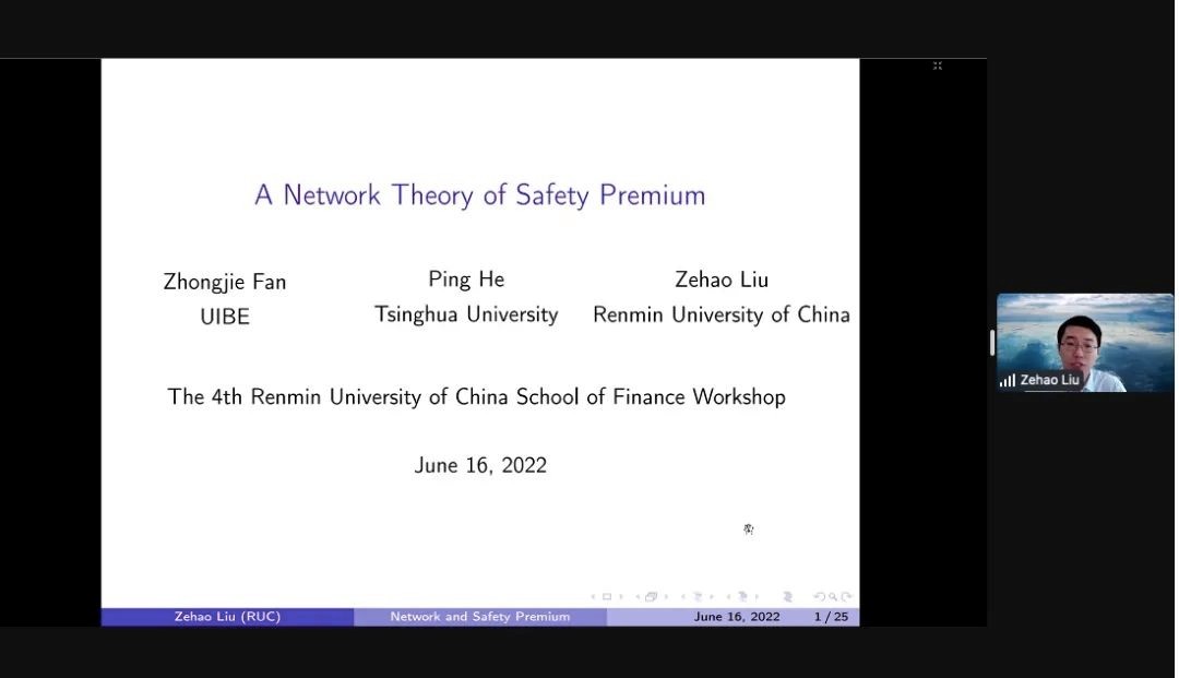 财金学院刘泽豪副教授分享了题为“A Network Theory of Safety Premium”(“安全溢价的金融网络理论”)的论文。文章认为,银行间市场的相互借贷行为使得负面冲击可能在银行网络中传播。在一个具有有向环(directed cycle)的银行网络中,金融风险的传染会导致经济存在多重均衡。安全资产由于可以抑制风险传染,因此投资者愿意为安全资产支付溢价。模型刻画了金融危机通过风险传染的放大机制:抵押品质量的小幅下降可能触发多重均衡之间的跳跃,从而导致银行间市场借贷量的大幅下降,以及安全资产溢价的大幅上升。