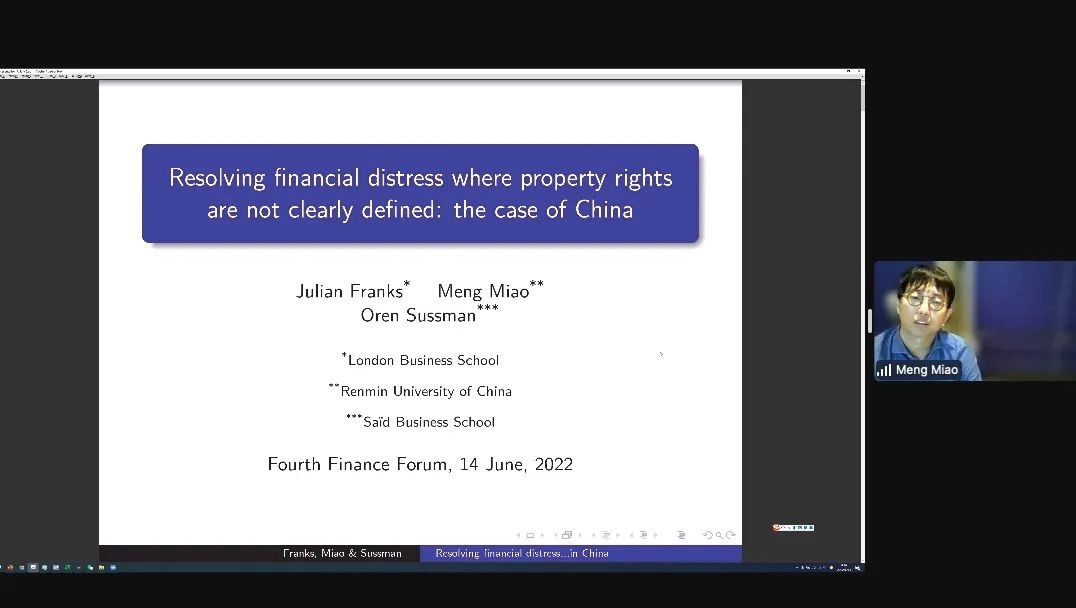 财金学院苗萌副教授分享了题为“Resolving Financial Distress Where Property Rights Are Not Clearly Defined: the Case of China”(“解决产权未明确界定的财务困境:中国案例”)的论文。文章使用陷入财务困境的中国公司的数据来研究产权未得到充分实施的经济体的运作情况。为帮助识别,文章关注省级收紧的产权管理。该政策显著改善了协调性,大幅降低债权人挤兑的发生率。即使没有详尽的破产法,仅仅执行合同权利也可足以实现债权人的协调。