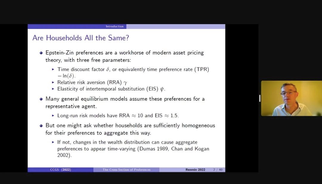 美国哈佛大学John Y. Campbell教授分享了题为“The Cross-Section of Household Preferences”(家庭偏好的横截面分析)的论文。论文利用瑞典家庭的数据,估计了Epstein-Zin效用函数参数的横截面分布。论文发现了风险厌恶存在一定程度的异质性,而时间偏好与跨期替代弹性存在较高水平的异质性。风险厌恶与跨期替代弹性在横截面维度不相关,而时间偏好与其他两个参数都弱负相关。文章估计,具有较高劳动收入和较高教育水平的家庭的风险厌恶程度较低,而进入样本的初始财富较低的家庭则具有较高的时间偏好率和较低的跨期替代弹性。