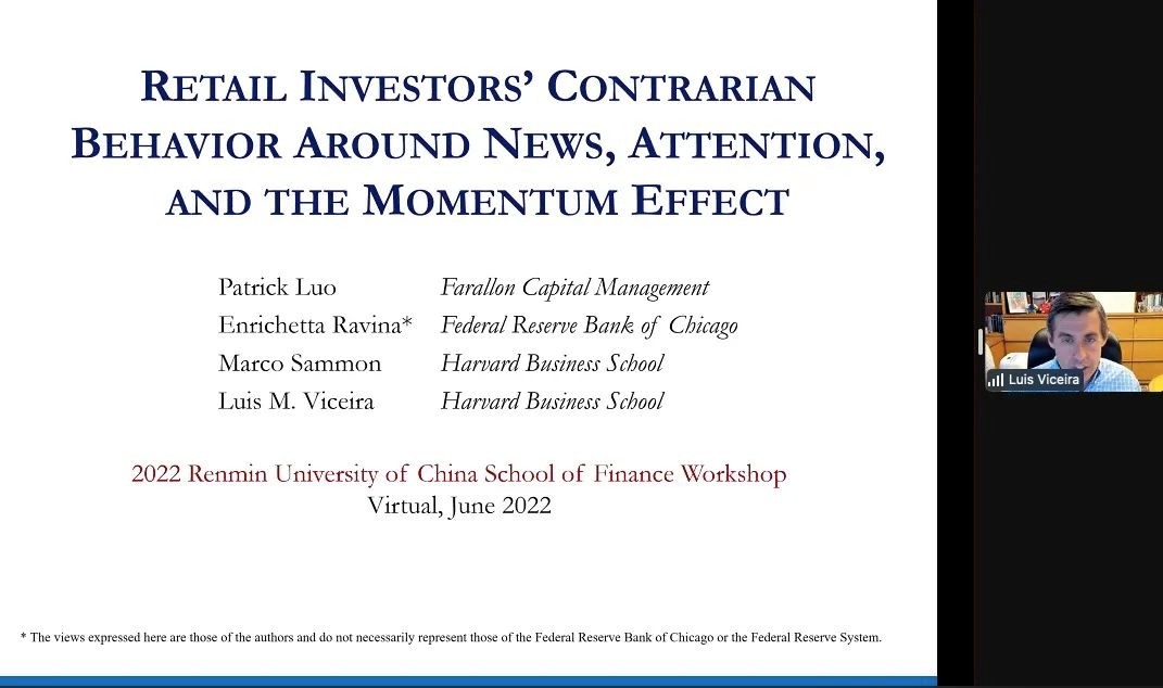 美国哈佛大学Luis M. Viceira教授分享了题为“Retail Investors’ Contrarian Behavior Around News, Attention, and the MomentumEffect”(“散户投资者围绕新闻、注意力和动量效应的逆向行为”)的论文。文章使用代表2010年至2014年期间美国零售交易领域的大量美国经纪账户交易和头寸数据,表明很大一部分散户投资者在出现巨额收益意外后进行逆向交易,亏损股票替代假设不能解释散户的逆势交易,尤其是逆势买入。