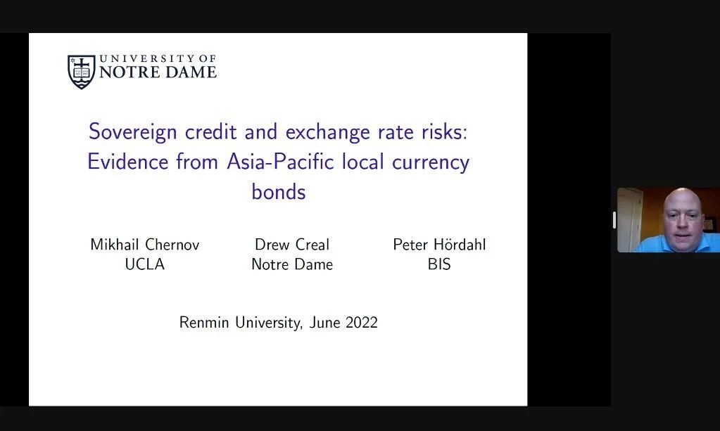 美国圣母大学Drew Creal副教授分享了题为“Sovereign Credit and Exchange Rate Risks: Evidence from Asia-Pacific Local Currency Bonds”(“主权信用和汇率风险:来自亚太本币债券的证据”)的论文。文章研究了新兴市场主权债券的动态特性及其相关的风险溢价。文章关注信用利差、汇率及其相互作用的属性,依托亚太主权国家发行的本币债券的期限结构,研究发现本地变量在货币和信用风险的动态变化以及债券风险溢价的构成中具有显著影响。
