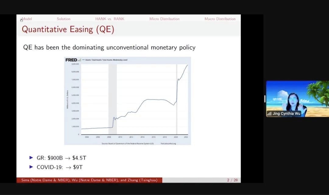 美国圣母大学Jing Cynthia Wu副教授分享了题为“Unconventional Monetary Policy According to HANK”(“基于HANK模型的非常规货币政策”)的论文。文章研究了异质性经济主体对量化宽松政策(QE)有效性的影响。研究发现,在一个异质性代理人新凯恩斯模型(HANK)中,宏观变量对于量化宽松政策冲击的反应,与同质性代理人新凯恩斯模型(RANK)非常相似。这一发现对于不同的财富分布是稳健的。