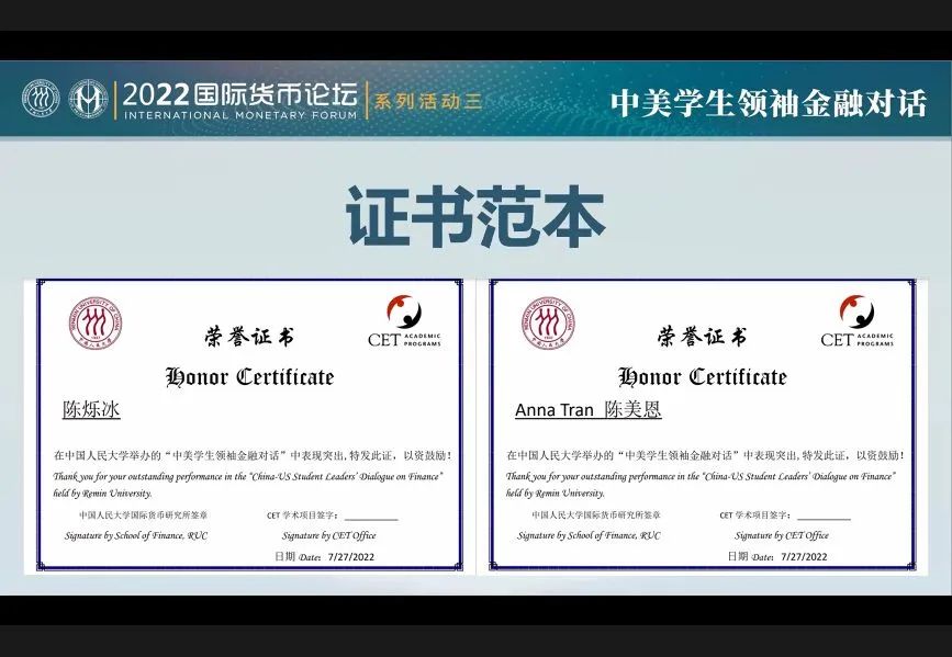7月27日上午,2022年中美学生领袖金融对话论坛于线上隆重举行。本届论坛作为2022国际货币论坛暨《人民币国际化报告》发布会的系列活动之一,由色情动漫 国际货币研究所和美国CET学术项目共同主办,色情动漫 团委及金桐全球英才计划协办。