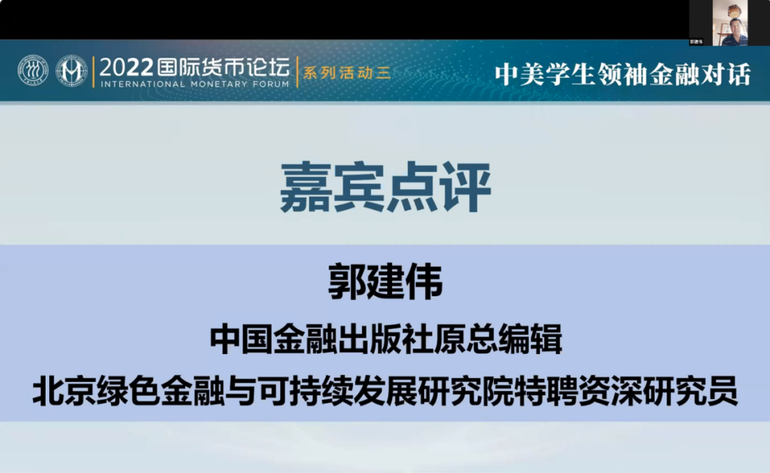 下半场,来自哈佛大学的Edwin Jin同学以中美竞争为背景,阐释了全球变暖的影响在发展中国家放大的原因,并针对中美如何通过“健康竞争”逐步解决发展中国家目前的气候变化危机发表了自己的观点;来自厦门大学的林柏帆同学基于中美两国视角对绿色债券的发展现状进行了分析,并针对绿色债券所面临的问题提出了中美跨境合作的创新方案;来自天津商业大学的林靖澄同学以中美绿色金融合作为背景,从中美绿色合作金融机制的成型基础出发,理清了合作机制的建设演化状况,并对发展堵点进行了梳理;来自乔治华盛顿大学的Olivia Pfeiffer同学聚焦中国的绿色信贷政策,探讨了中国绿色信贷政策的内容和优缺点,对美国是否应该制定相同政策提出了自己的看法,并表达了中美友好交流的期望;来自上海外国语大学的潘颖颖同学探讨了后疫情时代下的中美绿色金融国际合作的重要性,并结合中国经验就中美如何深化合作提出了看法和政策建议;来自哈尔滨工业大学的任堉秸同学着重介绍了中国在绿色金融国际合作上的行动以及中国绿色金融发展特色方案,并提出了优化当前绿色金融合作机制的措施;来自耶鲁大学的Anna Tran同学指出绿色金融的关键是解决环境资源问题和节能,并介绍了MethaneSAT甲烷卫星在数据收集方面的作用,为绿色金融的实现提供了新的思路;来自北京航空航天大学的张昊轩同学从中国工商银行基层工作者的视角切入,梳理了中国近期在绿色金融领域取得的进展,并通过中外对比研究,对中美、中外等双边和多边的国际化合作提出了建议;来自中央财经大学的张宏伟同学从“碳中和”和“ESG”两个具体的维度介绍了中美共同面临的碳中和目标,并针对碳排放和ESG的区域性差异问题发表了自己的观点。