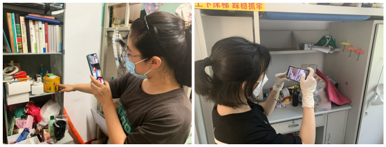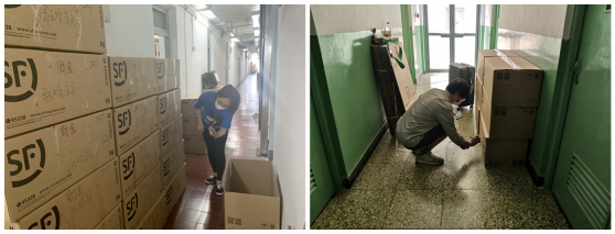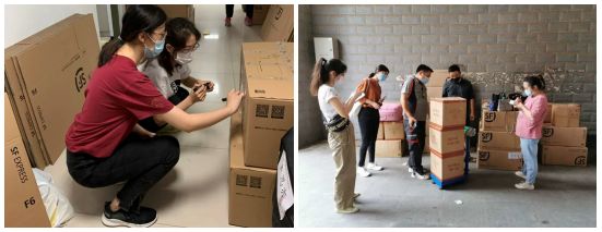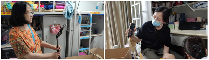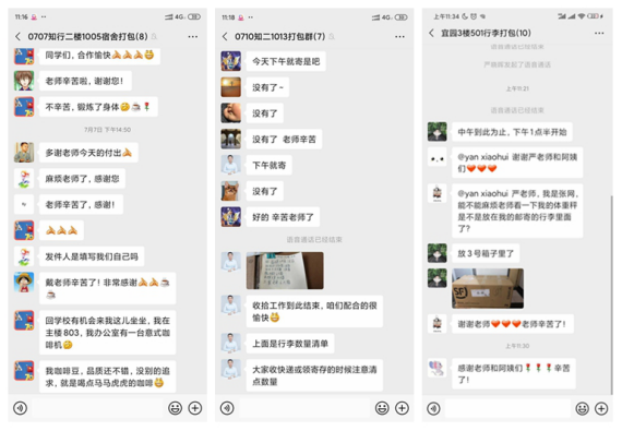根据“3+3+1+1”工作组安排,协调人事前建立每天各打包小组群,教职工志愿者在群内与委托代打包的同学沟通打包顺序以及其他个性化打包需求。每天早晨八点半,教职工志愿者在各宿舍楼下集合,听协调人介绍当天的具体安排和分工,随后分工进入到宿舍,当起了线上“主播”,耐心沟通、全程直播,帮助解决同学们的个性化需求,并为同学们的行李贴上标签,写下寄语。