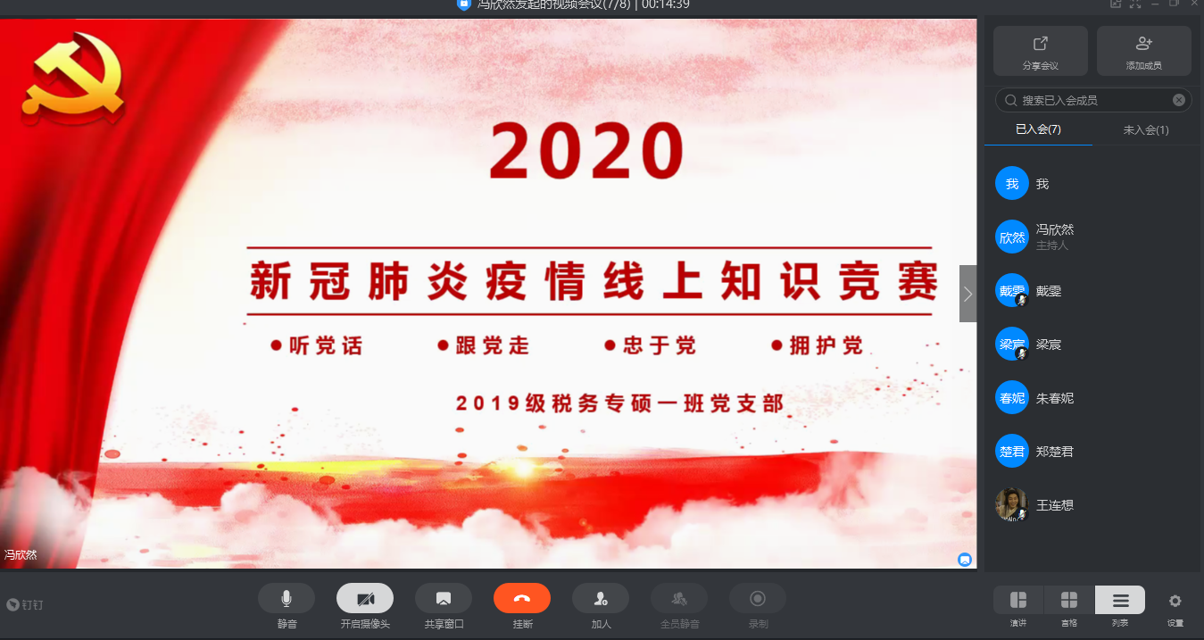 3月8日下午,2019级税务专硕二班党支部开展了“画好抗击疫情的同心圆”线上主题党日活动。支部党员学习了刘伟校长主讲的《如何看待新冠肺炎疫情影响下2020年中国经济增长》疫情防控公开课,并纷纷表达了对于此次疫情的看法。本次活动使得支部党员们对“此次疫情对中国经济的影响”有了进一步的了解,并表示应对未来就业早做准备,同时在抗击疫情工作中发挥支部党员的先锋模范作用,做到“在校不出校、京外不返京、京内不返校”。