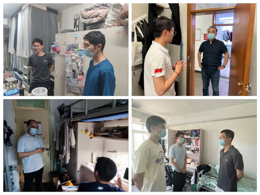 “线上上课有没有遇到什么问题?”“毕业论文修改得怎么样了?”“有去操场运动吗?”“今日的核酸检测完成了吗?”“在学习、生活上有没有什么困难?”在走访寝室的过程中,领导、老师、专职辅导员与同学们亲切交谈,向同学们询问学习生活情况、线上课程安排情况、就业升学计划等情况,解答同学们的困惑,对同学们充分理解和全力配合学校疫情防控表示感谢,提醒同学们要提高防范意识,注重防护,加强锻炼,养成良好生活习惯,面对疫情下的学习、就业、升学保持积极乐观的心态,如果有问题及时向班主任及辅导员老师反映情况。老师们还提示即将返乡学生在途中做好自身防护,注意交通安全、人身及财产安全,安全顺利返乡。