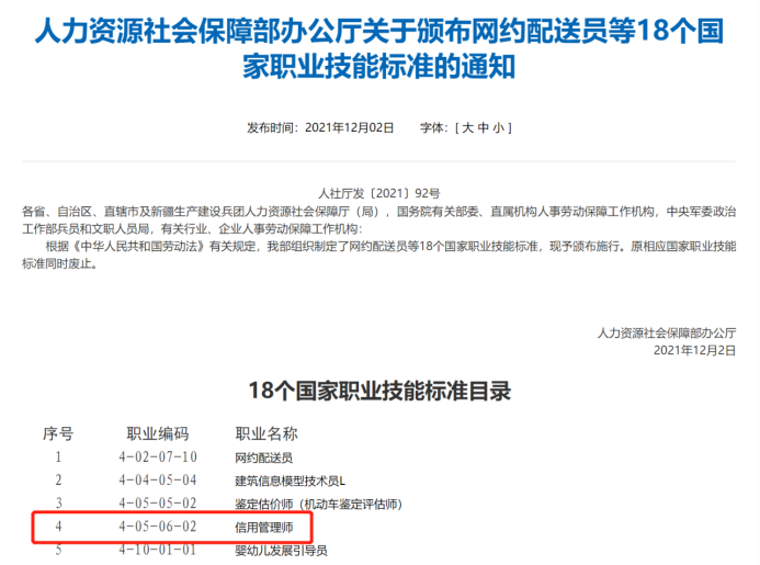 近日,人力资源和社会保障部颁布了网约配送员等18个国家职业技能标准,信用管理师在列。我校作为参与单位之一,我院吴晶妹教授作为主要起草人之一、关伟教授作为审定人之一,在信用管理师国家职业技能标准制定中发挥了积极作用