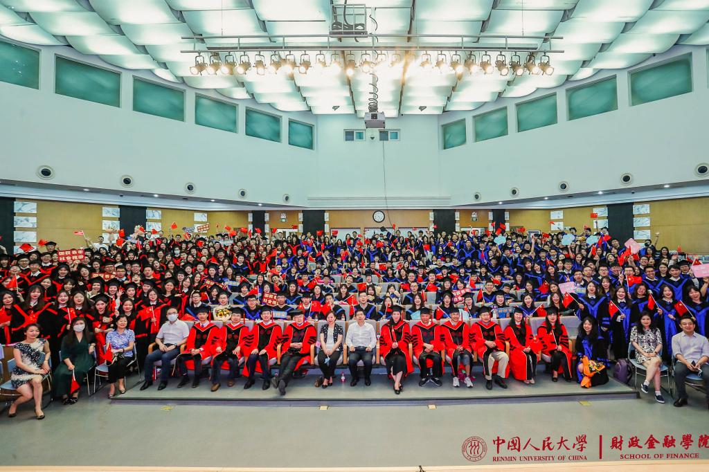 学位授予仪式上,伴随着激昂的音乐,庄毓敏、王国刚、岳希明、朱青、谭松涛、王芳、关伟、陈忠阳、马勇、何林等10位教授,为到场的2020届毕业生拨穗并颁发学位证书。