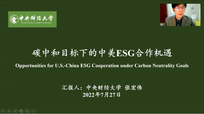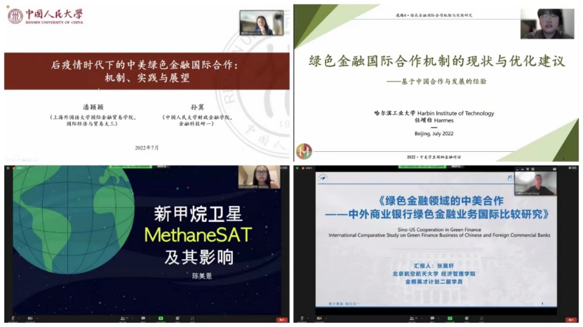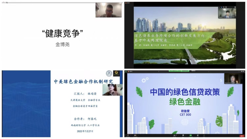 下半场,来自哈佛大学的Edwin Jin同学以中美竞争为背景,阐释了全球变暖的影响在发展中国家放大的原因,并针对中美如何通过“健康竞争”逐步解决发展中国家目前的气候变化危机发表了自己的观点;来自厦门大学的林柏帆同学基于中美两国视角对绿色债券的发展现状进行了分析,并针对绿色债券所面临的问题提出了中美跨境合作的创新方案;来自天津商业大学的林靖澄同学以中美绿色金融合作为背景,从中美绿色合作金融机制的成型基础出发,理清了合作机制的建设演化状况,并对发展堵点进行了梳理;来自乔治华盛顿大学的Olivia Pfeiffer同学聚焦中国的绿色信贷政策,探讨了中国绿色信贷政策的内容和优缺点,对美国是否应该制定相同政策提出了自己的看法,并表达了中美友好交流的期望;来自上海外国语大学的潘颖颖同学探讨了后疫情时代下的中美绿色金融国际合作的重要性,并结合中国经验就中美如何深化合作提出了看法和政策建议;来自哈尔滨工业大学的任堉秸同学着重介绍了中国在绿色金融国际合作上的行动以及中国绿色金融发展特色方案,并提出了优化当前绿色金融合作机制的措施;来自耶鲁大学的Anna Tran同学指出绿色金融的关键是解决环境资源问题和节能,并介绍了MethaneSAT甲烷卫星在数据收集方面的作用,为绿色金融的实现提供了新的思路;来自北京航空航天大学的张昊轩同学从中国工商银行基层工作者的视角切入,梳理了中国近期在绿色金融领域取得的进展,并通过中外对比研究,对中美、中外等双边和多边的国际化合作提出了建议;来自中央财经大学的张宏伟同学从“碳中和”和“ESG”两个具体的维度介绍了中美共同面临的碳中和目标,并针对碳排放和ESG的区域性差异问题发表了自己的观点。