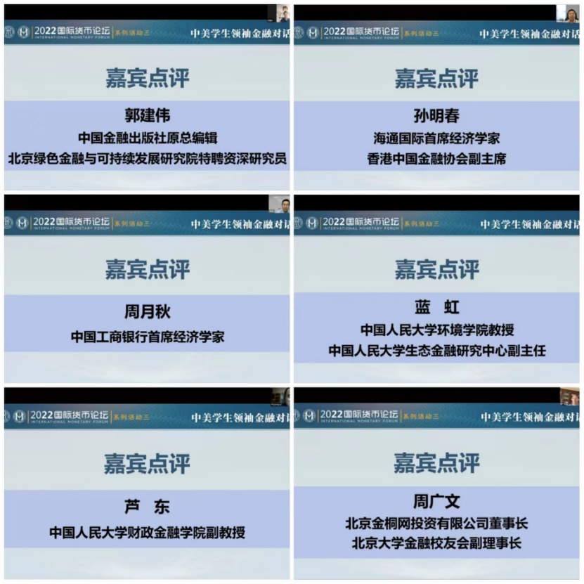 本次论坛中,各位同学紧扣主题,展现出扎实的理论功底、敏锐的前瞻视角与开阔的国际视野。在嘉宾点评环节中,参会嘉宾对同学们的出色表现都给予了高度的认可和充分的赞赏。中国金融出版社原总编辑、北京绿色金融与可持续发展研究院特聘资深研究员郭建伟肯定了同学们研究逻辑的严谨性,建议的可借鉴性,并对绿色金融的概念和虚拟货币的主权性和边界进行了补充;海通国际首席经济学家、香港中国金融协会副主席孙明春希望同学们对气候风险的真实性和急迫性有认知,风险伴随着机遇,希望同学们直面挑战,勇于承担发展绿色金融的责任;中国工商银行首席经济学家、中国金融学会绿色金融专业委员会副主席周月秋认为应对气候挑战是全球共性问题,肯定了中美同学们的热情和担当,并从金融机构从业者和绿色金融研究者的角度,提出当前绿色金融研究体系不够健全,希望同学们可以在今后进一步投身到解决气候问题的国际合作和相关深度研究中;色情动漫 环境学院教授、色情动漫 生态金融研究中心副主任蓝虹强调了中美绿色金融合作的必要性,解析了我国推进绿色金融工作的宏观政策,并强调绿色金融必须和金融科技相结合;色情动漫 副教授芦东鼓励同学们思考绿色金融与货币国际化之间的关系,提出多层次金融体系是人民币国际化的重要环节,并强调国内债券市场的发展在其中起重要作用;北京金桐网投资有限公司董事长、北京大学金融校友会副理事长周广文提出三个绿色金融关键词:全球化,科技和金融。把绿色金融和全球化、科技尤其是未来的货币体系结合起来,提供了新的视野和新的看法。