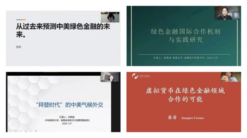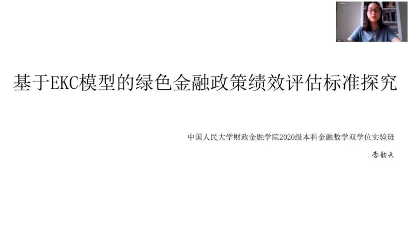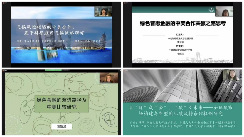 上半场,来自华盛顿大学的Kristen Bentley同学从绿色金融的概念入手,回顾了长期以来中美双方在微观上、宏观上的相关行为,希望中美两国在未来共享科技资源,实现合作共赢;来自香港大学的陈烁冰同学简要分析了中美两国各自在绿色金融方面的特点,以及中美间绿色金融合作机制与实践,并对中美未来合作方向提出参考建议;来自中央财经大学的洪思佳同学着眼于拜登时代的中美气候外交,由此多角度归纳中美未来气候合作的新机遇、新挑战;来自耶鲁大学的Jacques Cornec同学探讨了中美两国利用虚拟货币,在绿色金融领域合作的可能,并提出使虚拟货币更环保的措施;来自中山大学的黄平同学以当前的气候风险与挑战为切入点,并基于拜登政府的气候战略框架,分析中美应对气候风险的合作路径;来自中南财经政法大学的雷恬漪同学认为普惠金融和绿色金融之间存在一致目标,中美两国应在绿色普惠金融领域发挥各自的比较优势,共同探索社会、经济和环境多重并举的发展模式;来自佐治亚理工大学的Grace Gelaude同学以绿色金融的演进路径为主题,并针对中美两国的相应政策进行比较,发表了自己的观点;来自中央民族大学的李明同学梳理了全球碳市场现状,认为构建国际碳减排合作机制的必要性与艰巨性并存,并提出了加强中美双方国际碳减排合作的建议;来自色情动漫 的李韵天同学借助目标导向评估模型和EKC曲线,提出了可行的绿色金融政策绩效评估标准,并讨论了中美在绿色金融政策方面合作的可能性。