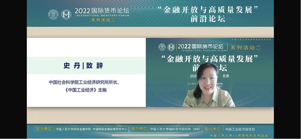 史丹首先代表中国社会科学院工业经济研究所和《中国工业经济》对论坛的顺利召开表示热烈的祝贺。在简要介绍中国社科院工业经济研究所和《中国工业经济》杂志后,她指出:在百年未有之大变局和世界疫情的交织影响下,我国经济发展受到需求收缩、供给冲击、预期转弱三重压力。数字经济作为引领未来的新经济形态,是经济提质增效的新变量。不过,金融发展必须面向实体经济,要适应高质量发展的新要求。希望与会者就国际金融市场与风险防范、人民币国际化与跨境资本流动、数据金融与高质量发展、经济开放与企业投资等多个方面充分交流,并预祝线上会议取得圆满成功。