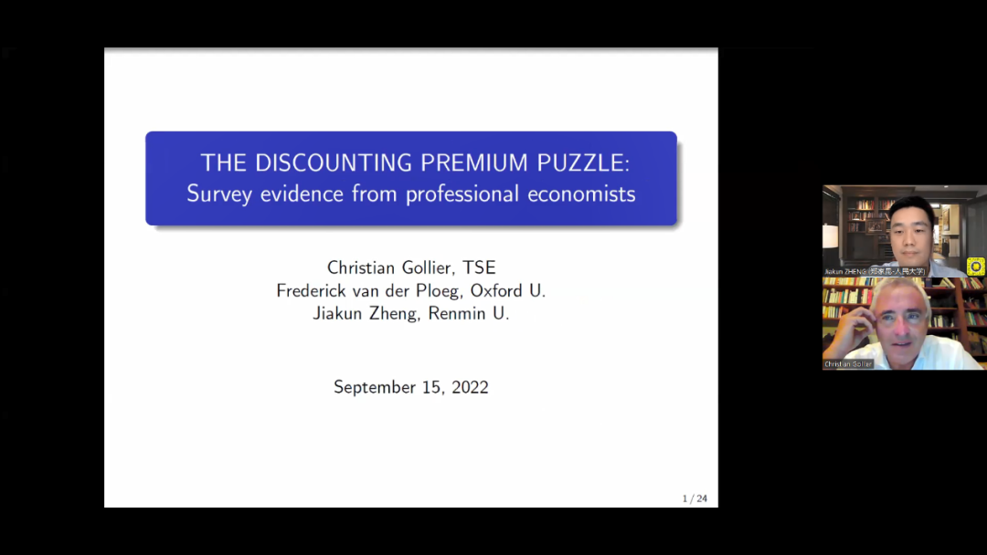 在学术报告中,Christian Gollier教授首先回顾了社会贴现率领域的已有研究,指出如何确定社会贴现率是一个涉及多学科的复杂问题,他通过对来自全球各地的专业的经济学家们展开问卷调查来重新探索这一问题,他的研究不局限于校准拉姆塞规则(Ramsey rule)等传统问题,而是关注潜在的贴现率多重相关性等更广泛的问题。他的研究旨在了解绝大多数专业的经济学家们是否认识到有必要依据现代资产定价理论的精神,根据所评估的公共项目的风险状况来调整贴现率,即使用风险调整贴现率(Risk-adjusted discountrates)。他的研究结果发现,四分之三的受访者建议根据受审查项目的风险状况调整贴现率,这与世界上大多数公共行政部门使用单一贴现率的标准做法截然不同。他也观察到,经济学家们对于明显不同的风险状况赋予的贴现率之间的差异并不显著,从而可能产生“贴现溢价难题”,即与金融市场对私人投资的实际做法相比,经济专家对高风险公共项目的惩罚要少得多。这一研究对公共项目成本效益分析具有重要意义。