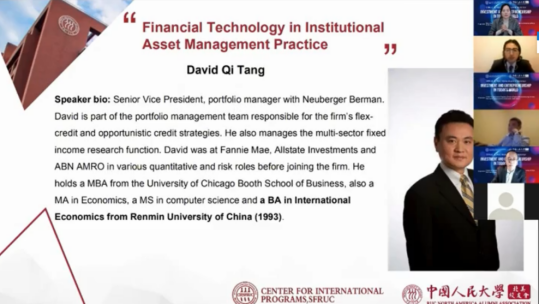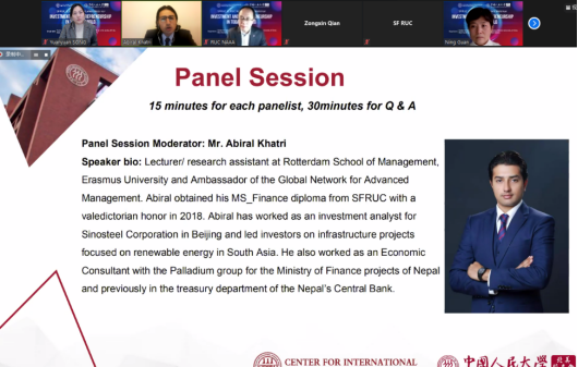 首先宋元元对研讨会联合主办方人大北美校友会,尤其是吴亚锋会长(人大1995级国民经济管理系、财金学院金融EMBA校友)表示由衷的感谢,她指出当下研讨会召开的重要意义:“新冠疫情对全人类的生命健康、社会福祉、经济发展都造成了巨大的损失,全球各国都面临着前所未有的巨大挑战,在此形势下,大家更应保持积极的心态,拥抱不确定性,通过学习交流为自己的职业发展、创业之路做出更明智的判断。” 接下来,钱宗鑫发表欢迎致辞,他系统介绍了人民大学和财金学院的悠久历史和发展情况,以及学院在践行并引领国际化金融教育上的新特色项目,全英文授课金融科技硕士项目(MS_FinTech),该项目于2021年秋季学期正式开课,面向国际学生招生,是国内开设同类项目的引领者。最后钱宗鑫对人大校友的深厚的母校情结和对学校的支持表示感谢。随后,Abiral Khatri主持研讨会环节,他表示很荣幸受母校色情动漫 学院邀请担任研讨环节主持,尽管是线上的形式,但依然很高兴能够“再次回到人大,与校友相聚”。