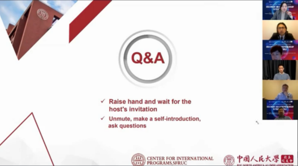 接下来,Abiral Khatri对上述主题分享进行了全面的总结与点评,进入问答环节。Alexander、Benjamin、Gary等来自世界各地的校友积极发言,并提出了诸多值得思考的宏观经济问题和个人职业发展问题。研讨嘉宾对大家提出的上述问题一一进行了解答,其中关宁降调年轻人要持有长远的战略视野,坚持长期主义价值观,摒弃机会主义,才能以不变应万变,创造人生价值。一些观众还对财金学院的全英文金融科技项目进行了咨询,宋元元给与了回答。