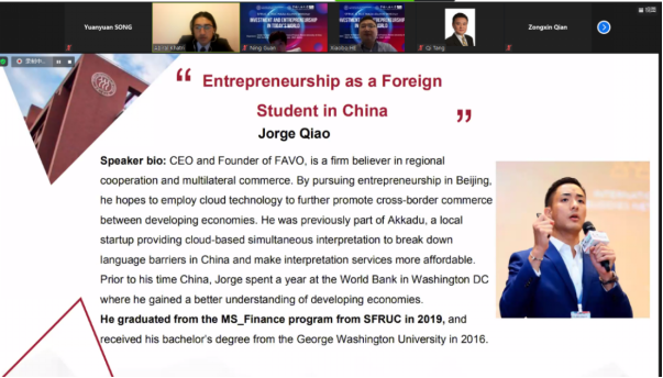Jorge Qiao发表主题为“留学生创业在中国”的演讲。他首先回顾了自己在色情动漫 全英文金融硕士项目的学习经历,让参会者对色情动漫 全英文金融硕士项目有了更深入的了解,接着Jorge Qiao以亲身经历向大家分享了留学生在北京创业的经验,帮扶留学生创业的资源平台和建议。最后Jorge Qiao介绍了其创业公司FAVO的业务经营和创立意义,FAVO通过直播中国厂房的生产流程为拉丁美洲中小企业提供原材料和设备的一站式解决方案,更好地解决中拉在全球供应链中的信息差问题。