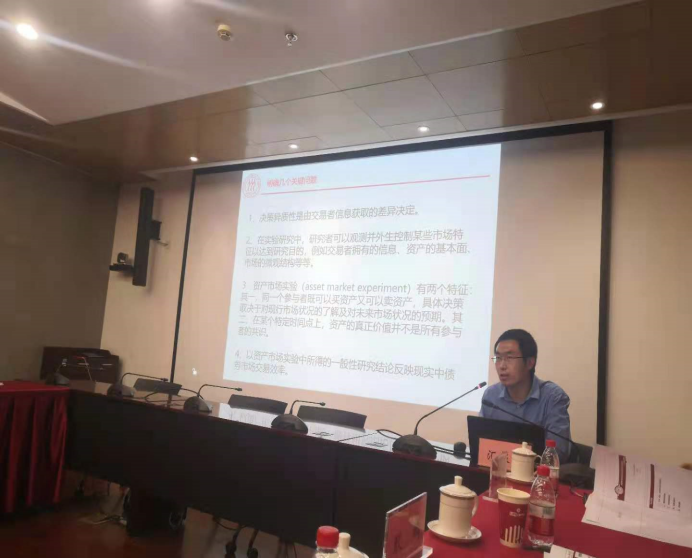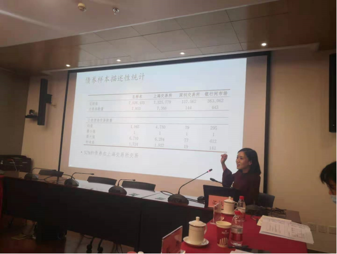 在成果汇报环节,各项子课题的汇报人依次向与会嘉宾汇报了中期研究成果。类承曜教授分享了有关国债收益率曲线作为存贷款利率基准可行性的分析并提出了相关政策建议,王宏博同学汇报了债券市场信用评级机制并探讨了信用评级的有效性,何林教授和梅博韬、冯桂芳同学分享了债券违约处置机制与债券市场风险化解方式,邓晴元同学介绍了其所在研究团队构建的债券市场质量评价指标,梁墨助理教授汇报了有关债券市场价格信息含量与资本配置效率的实证研究成果,芦东助理教授和詹钥凇同学分析了中国债券场内外市场不同的交易机制对债券定价的影响,郭彪副教授介绍了潜在流动性这一衡量我国债券市场流动性的新方法,对外经济贸易大学的李志冰和施一宁助理教授分享了信息披露对健全债券市场发展的效果,首都经济贸易大学的王一子助理教授从实验经济学的角度汇报了决策异质性对债券市场交易效率的影响。