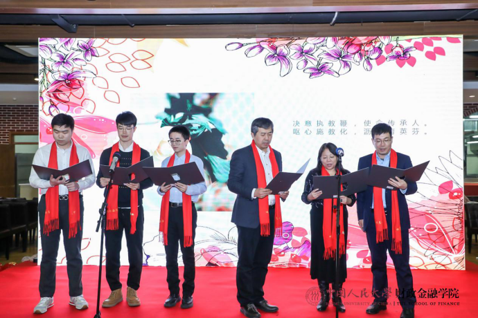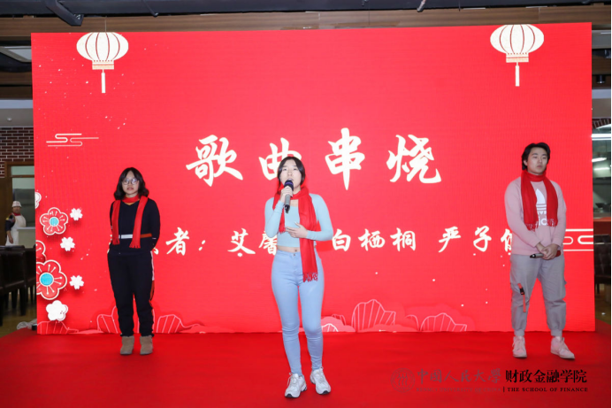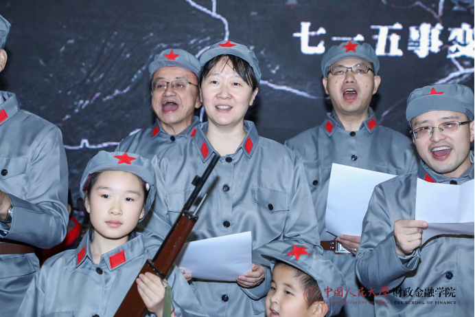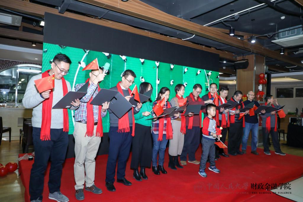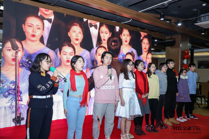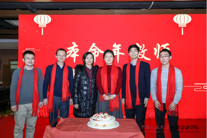 热闹喜庆的歌曲串烧拉开了联欢会的序幕。保险系的小嘉宾徐魏泽同带来京剧《沙家浜》选段,别具一格的唱腔赢得了阵阵掌声和喝彩。货币金融系教师和张致博、张乐仪、何昊泽、何允泽小朋友化身工农红军,为大家带来雄浑壮阔的毛主席诗词朗诵,令人热血沸腾。在任淮秀教授的荣休仪式环节,他的门生及同事以纪念视频和诗朗诵的形式表达了对他深切的敬仰和感激。财政系老师带来了2019年的最佳金曲《我和我的祖国》,回顾十月的爱国主义课堂,表达了热切的爱国之情。参加一二九合唱的五位教师及部分学生再次唱响《追寻》,用优美的歌声重现如论舞台上的辉煌时刻。学院教工子女为大家带来“快乐三部曲”舞蹈串烧,现场气氛被推向高潮。学院为本命年老师送上了蛋糕和真挚的祝福。最后,全体老师和演员共同合唱《明天会更好》,表达对新一年的美好展望,为联欢会画上了圆满的句号。